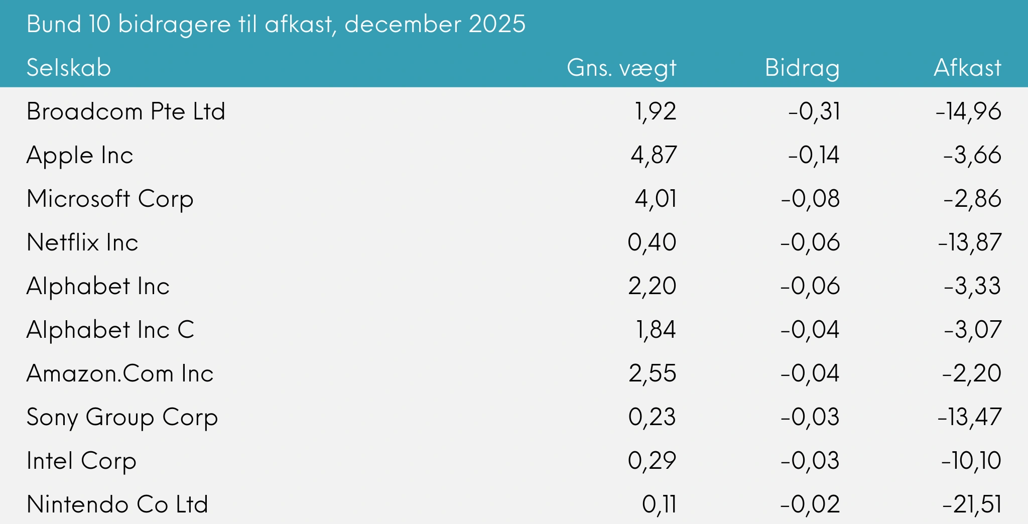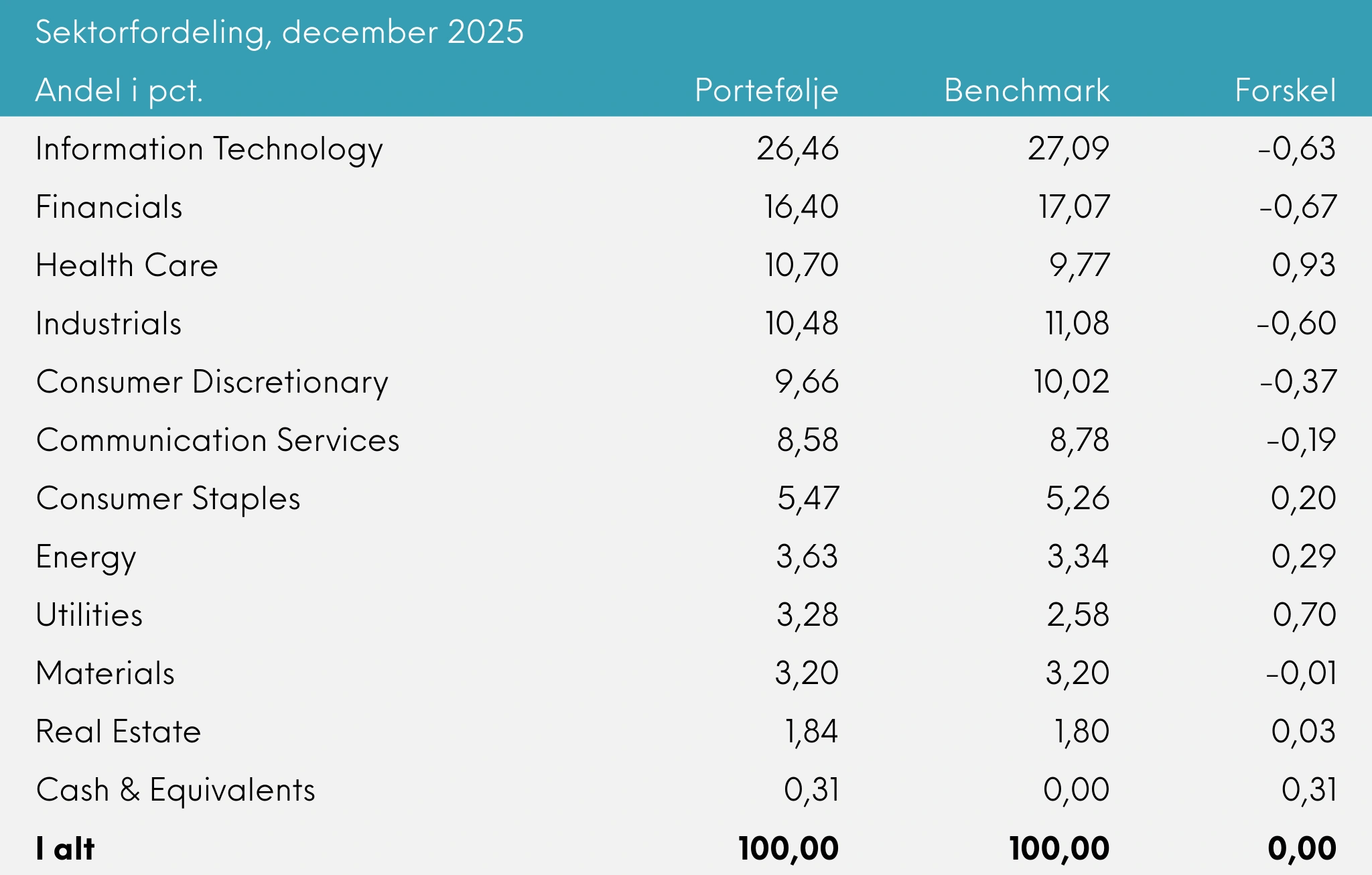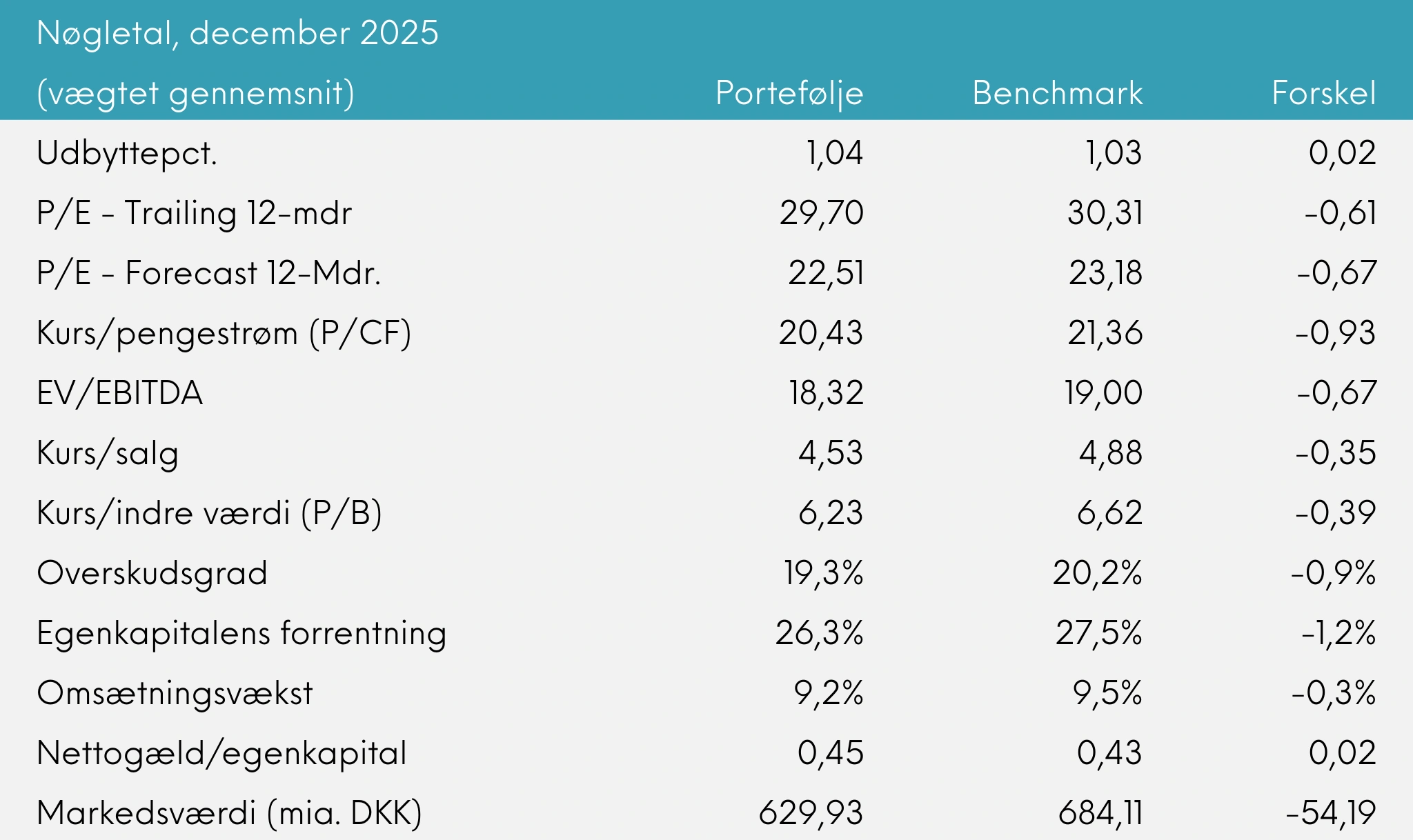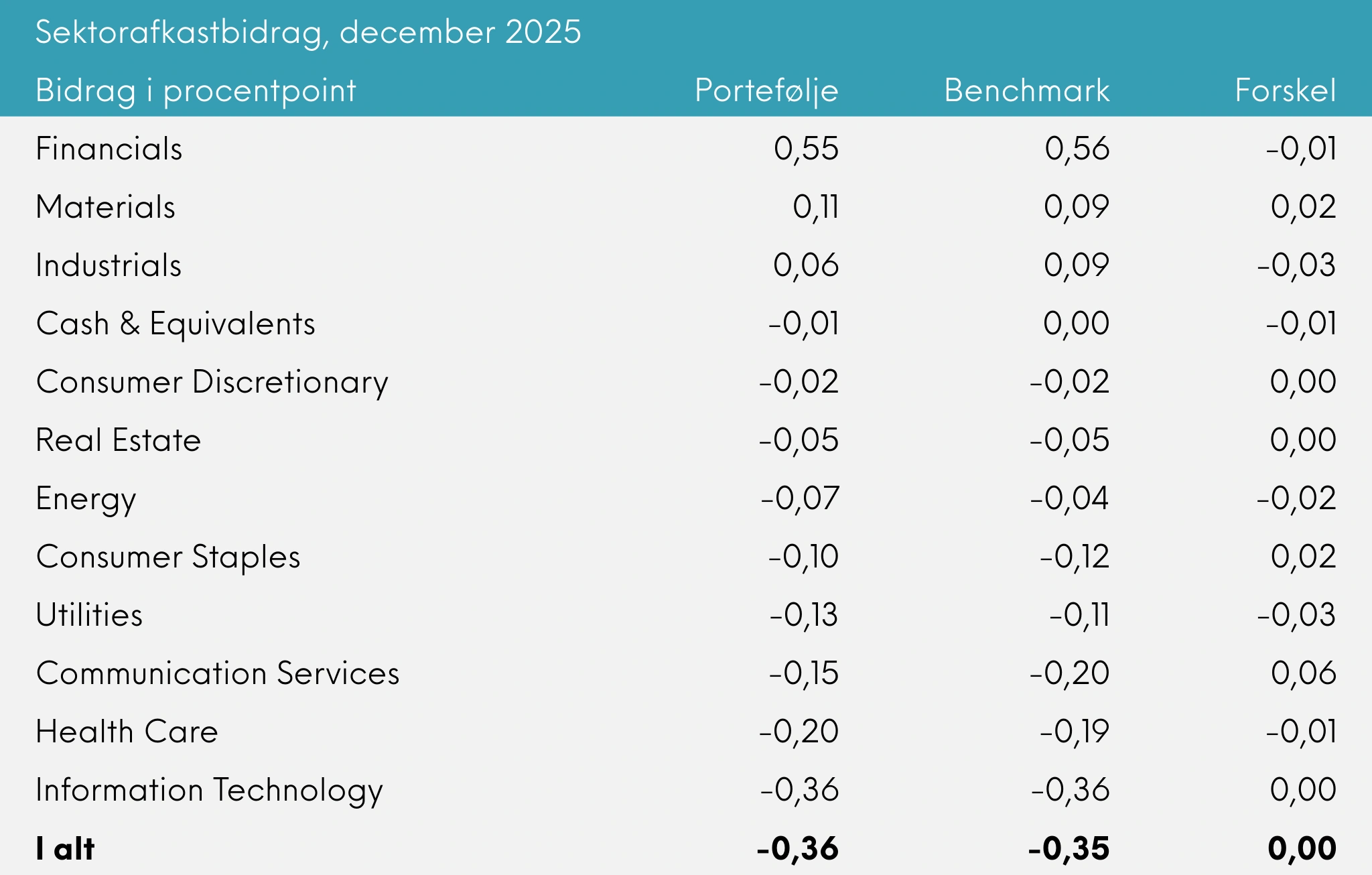 Porteføljen gav et afkast på -0,30% i december, hvilket var lidt bedre end benchmark, der gav -0,38%.