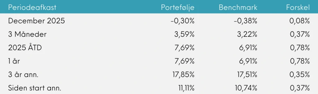 2025 blev afrundet på fornem vis. Et samlet merafkast mod benchmark på 0,78% for året er helt i tråd med vores langsigtede målsætning.